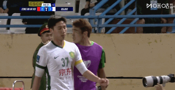 易边再战,第50分钟国安后防注意力不集中,河内公安前场界外球快发,阮庭北突入禁区后传中造险,江文豪抢先一步解围的同时被对手铲倒。
